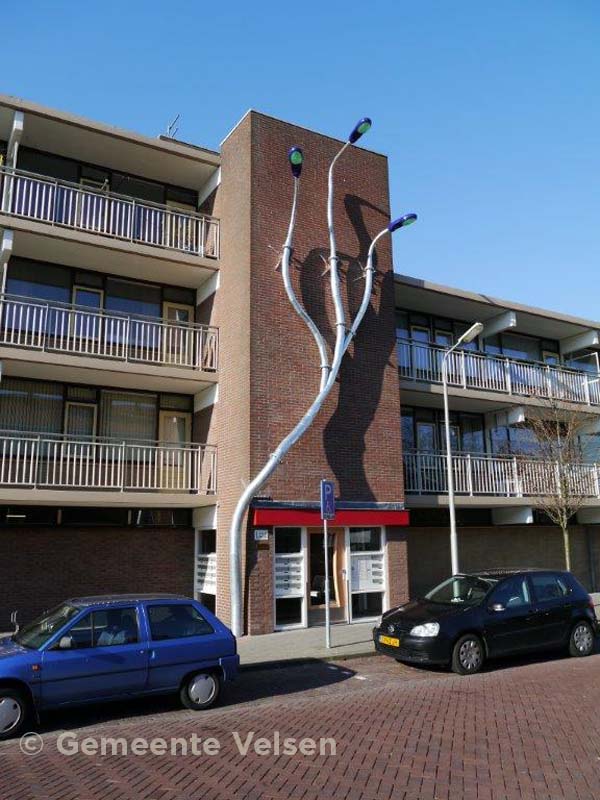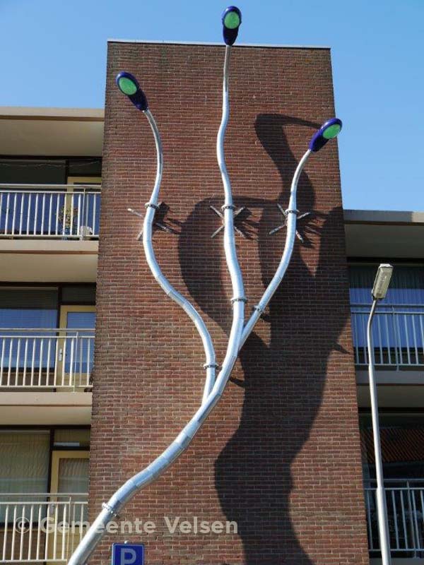 Kunstenaar Luk van Soom raakte geïnspireerd door een moderne woning die begroeid was met wilde wingerd; in de zomer een woeste zee van bladeren en in de winter een boeiend grafisch patroon. Het organisch takkenstelsel treedt in dialoog met het strak geordend spel van de bakstenen. Het kunstwerk bestaat uit meerdere delen: 2 constructies op naast elkaar gelegen gevels van appartementencomplexen en bij ieder complex een werk in de centrale hal. De lichten schijnen ‘s avonds bij het ene complex blauw en bij het andere groen. Het werk is eigendom van het Woningbedrijf Velsen.